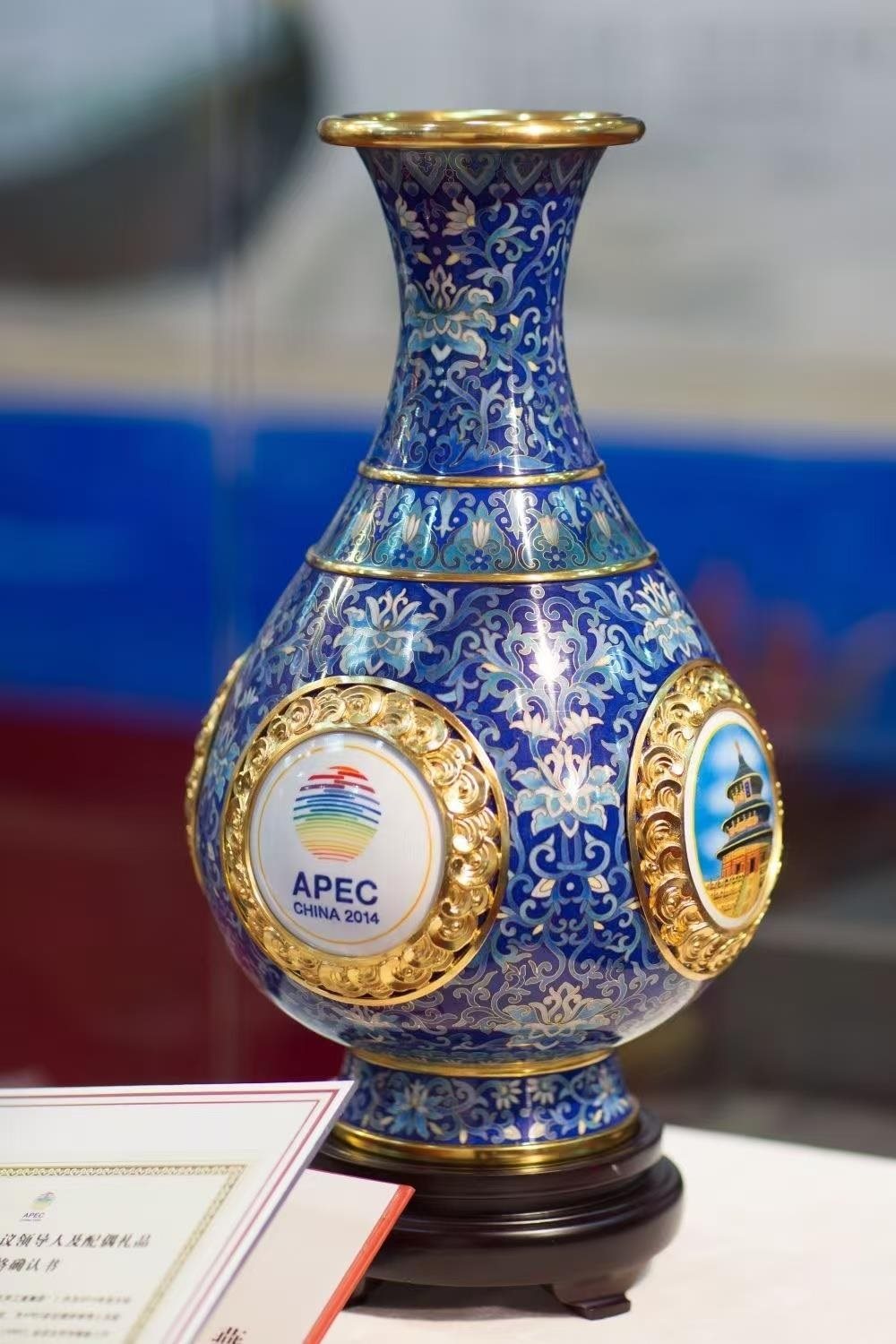 2014年11月,北京APEC會(huì)議在雁棲湖畔舉行。為歡迎參會(huì)的各經(jīng)濟(jì)體領(lǐng)導(dǎo)人,習(xí)近平主席選定了一件國禮——“四海升平”景泰藍(lán)賞瓶。賞瓶的細(xì)節(jié)蘊(yùn)含巧思:瓶高38厘米,是天壇祈年殿38米的等比例縮??;最大直徑21厘米,代表APEC的21個(gè)經(jīng)濟(jì)體。碧藍(lán)的瓶身雕著水紋,既象征“四海”也代表環(huán)太平洋?!捌俊笔恰捌健钡闹C音,連起來即“四海升平”。