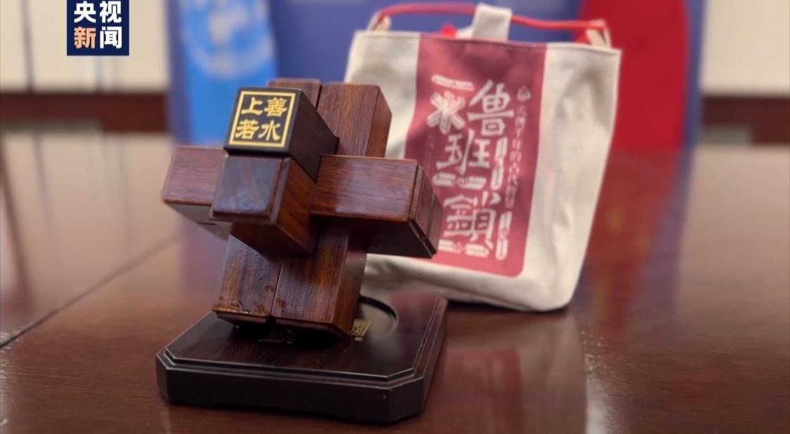 六根棕色木條相互巧妙鎖定,構(gòu)成一個(gè)穩(wěn)定的整體。這是中國擔(dān)任2023年11月聯(lián)合國安理會(huì)輪值主席首日向安理會(huì)成員贈(zèng)送的禮品——魯班鎖。