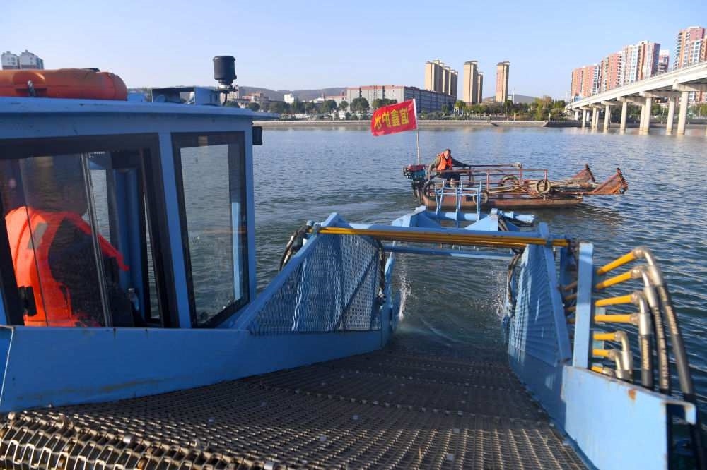 2024年10月28日,清漂員在丹江口水庫作業(yè)(無人機(jī)照片)。