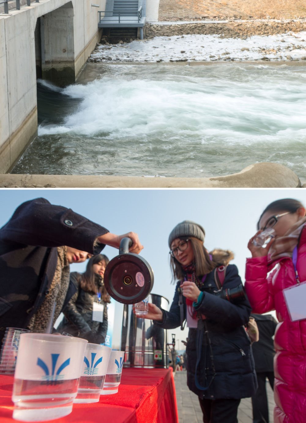 2014年12月27日,南水北調(diào)中線一期工程總干渠終點團(tuán)城湖明渠開閘放水(上圖);參加通水儀式的嘉賓在北京品嘗了來自丹江口的水(下圖,拼版照片)。