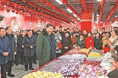 沈陽(yáng)大東副食品商場(chǎng)歷史悠久,富有特色的年節(jié)商品琳瑯滿目。23日上午,習(xí)近平來(lái)到這里,察看多家店鋪,頻頻同店主和顧客交流,詳細(xì)了解節(jié)日期間市場(chǎng)供應(yīng)情況。大家見到總書記都十分激動(dòng),連聲歡呼“總書記好”!習(xí)近平對(duì)大家說,“菜籃子”、“米袋子”、“果盤子”是民生大事,現(xiàn)在物質(zhì)豐裕,過年團(tuán)圓更要讓大家吃得好、吃得健康。