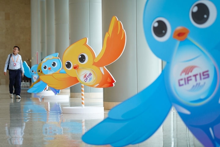 2024年9月11日在國家會議中心拍攝的服貿會吉祥物“福燕”形象。新華社記者 陳鐘昊 攝