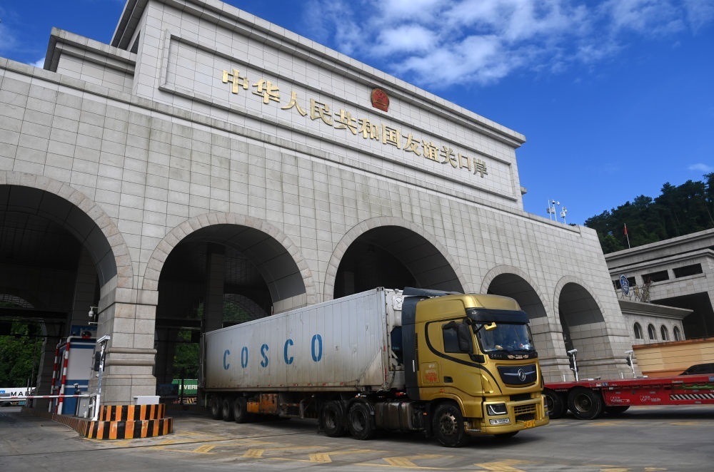 2024年8月26日,一輛貨車(chē)通過(guò)廣西憑祥友誼關(guān)口岸。友誼關(guān)口岸是西部陸海新通道的重要節(jié)點(diǎn),是中國(guó)通往東盟最大的陸路口岸,也是我國(guó)通往越南最便捷的陸路大通道之一。滿載著東盟國(guó)家特色水果、農(nóng)副產(chǎn)品與中國(guó)電子配件、大型設(shè)備等貨品的車(chē)輛在此“雙向奔赴”、川流不息。2024年,友誼關(guān)口岸年內(nèi)出入境貨車(chē)數(shù)量首次突破50萬(wàn)輛次,同比增長(zhǎng)15.96%,創(chuàng)歷史新高。