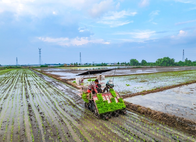 6月14日,在江蘇省興化市陳堡鎮(zhèn)蔣莊村,農(nóng)民在田間將剛起的秧苗裝車(無(wú)人機(jī)照片)。