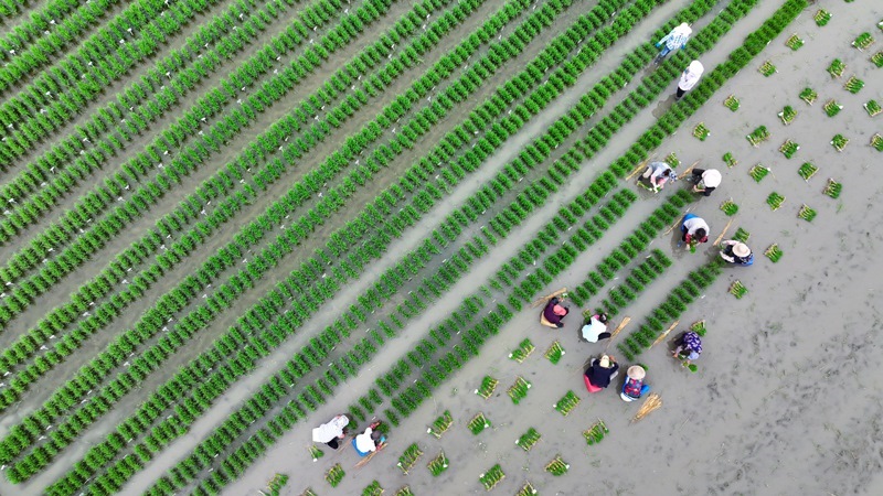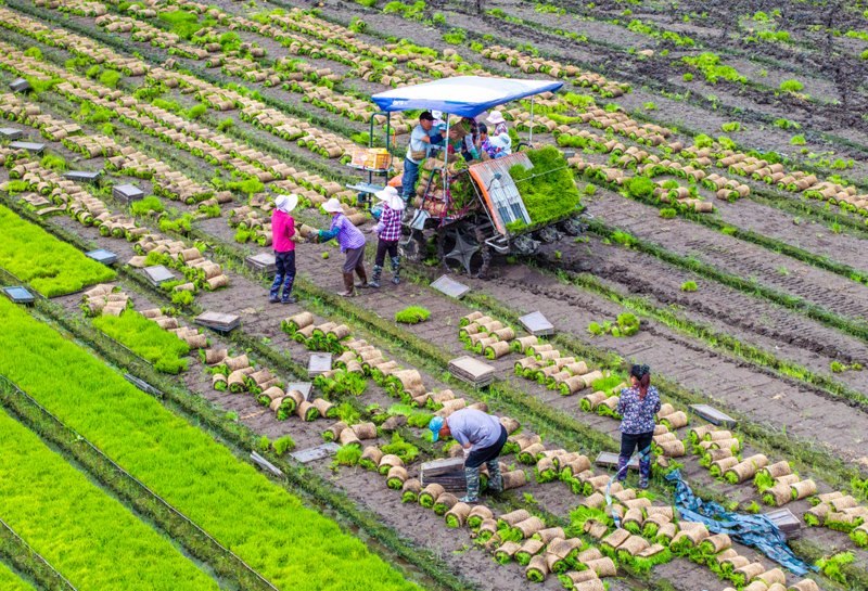 6月14日,在江蘇里下河地區(qū)農(nóng)科所(揚(yáng)州市農(nóng)科院),農(nóng)民在田里起秧、運(yùn)秧(無(wú)人機(jī)照片)。