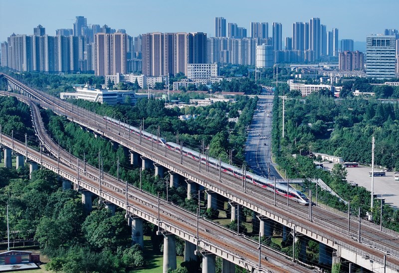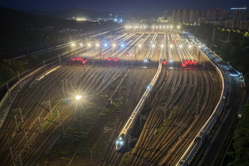 6月30日,動(dòng)車組列車駛出南京動(dòng)車段南京南動(dòng)車運(yùn)用所(無人機(jī)照片)。