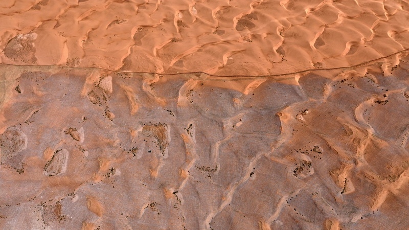 這是6月30日在寧夏中衛(wèi)市長流水村拍攝的騰格里沙漠東南緣治沙鎖邊工程現(xiàn)場(無人機照片)。