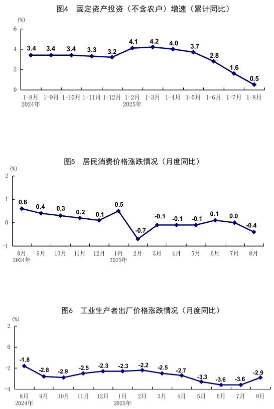 1—8月份,全國固定資產(chǎn)投資(不含農(nóng)戶)326111億元,同比增長0.5%;扣除房地產(chǎn)開發(fā)投資,全國固定資產(chǎn)投資增長4.2%。分領(lǐng)域看,基礎(chǔ)設(shè)施投資同比增長2.0%,制造業(yè)投資增長5.1%,房地產(chǎn)開發(fā)投資下降12.9%。全國新建商品房銷售面積57304萬平方米,同比下降4.7%;新建商品房銷售額55015億元,下降7.3%。分產(chǎn)業(yè)看,第一產(chǎn)業(yè)投資同比增長5.5%,第二產(chǎn)業(yè)投資增長7.6%,第三產(chǎn)業(yè)投資下降3.4%。民間投資同比下降2.3%;扣除房地產(chǎn)開發(fā)投資,民間投資增長3.0%。高技術(shù)產(chǎn)業(yè)中,信息服務(wù)業(yè),航空、航天器及設(shè)備制造業(yè),計算機及辦公設(shè)備制造業(yè)投資同比分別增長34.1%、28.0%、12.6%。8月份,固定資產(chǎn)投資(不含農(nóng)戶)環(huán)比下降0.20%。