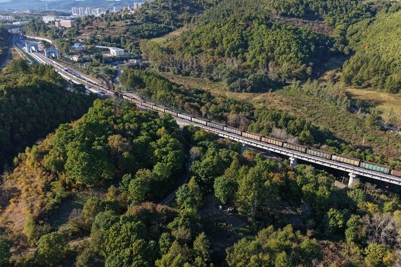9月27日,滿載大宗品類貨物的入境列車在濱綏鐵路綏芬河至國境線提質(zhì)改造工程新線路上行駛(無人機照片)。