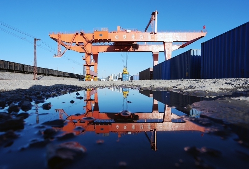 9月27日,在綏芬河站集裝箱換裝場,龍門吊在對回程中歐班列進行換裝作業(yè)。