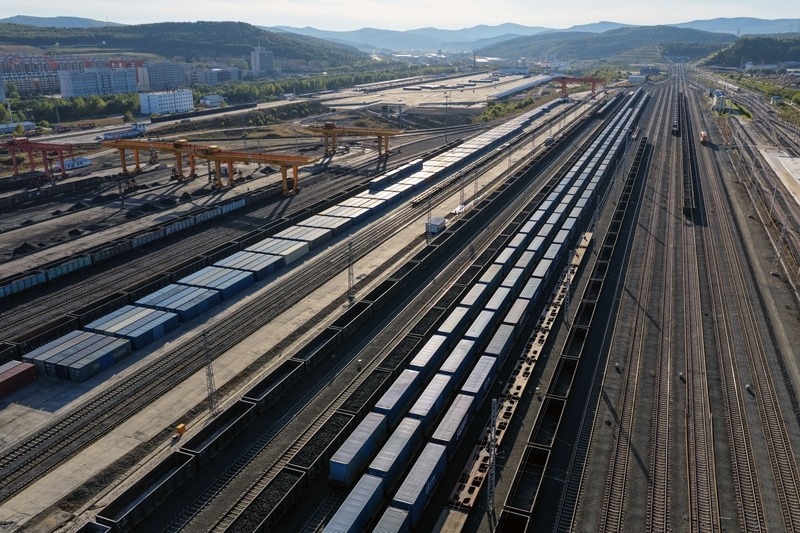 9月27日,滿載貨物的列車在綏芬河站北場進行換裝作業(yè)(無人機照片)。