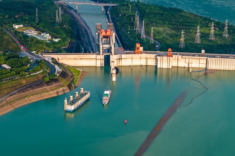 7月1日,在湖北宜昌,船舶有序通過三峽升船機(jī)(無人機(jī)照片)。