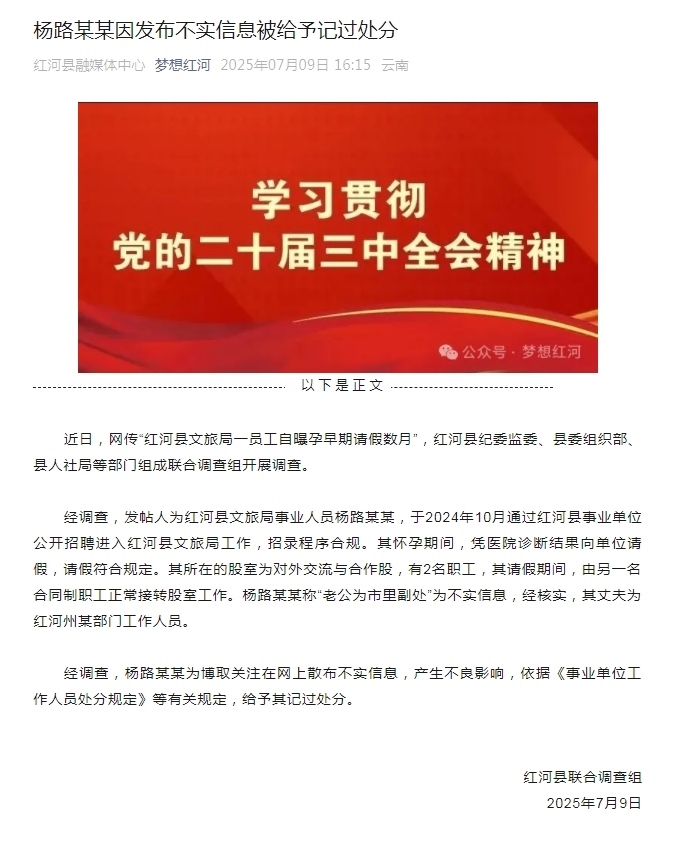 經(jīng)調(diào)查,發(fā)帖人為紅河縣文旅局事業(yè)人員楊路某某,于2024年10月通過紅河縣事業(yè)單位公開招聘進(jìn)入紅河縣文旅局工作,招錄程序合規(guī)。其懷孕期間,憑醫(yī)院診斷結(jié)果向單位請假,請假符合規(guī)定。其所在的股室為對外交流與合作股,有2名職工,其請假期間,由另一名合同制職工正常接轉(zhuǎn)股室工作。楊路某某稱“老公為市里副處”為不實(shí)信息,經(jīng)核實(shí),其丈夫為紅河州某部門工作人員。