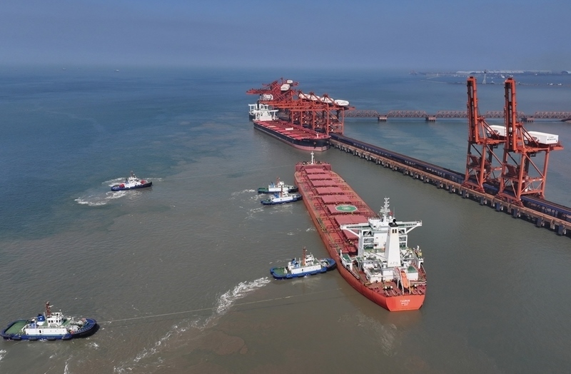 7月18日,輪船在拖輪的協(xié)助下向唐山港曹妃甸港區(qū)礦石碼頭靠泊(無人機照片)。