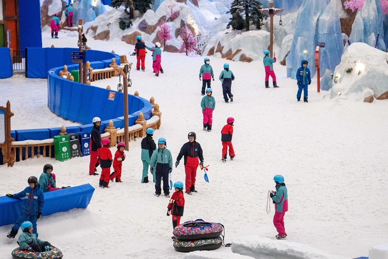當(dāng)日,湖南長沙發(fā)布當(dāng)?shù)亟衲晔讉€高溫紅色預(yù)警,部分區(qū)域最高氣溫升至40℃以上。位于長沙大王山旅游度假區(qū)的湘江歡樂城歡樂雪域迎來眾多游客。據(jù)了解,這是湖南最大冰雪綜合體之一,深入地下36米打造,溫度常年保持在零下5℃左右,擁有3萬平方米的滑雪與娛雪區(qū)域,能為游客帶來“夏日玩雪”的奇妙體驗(yàn)。