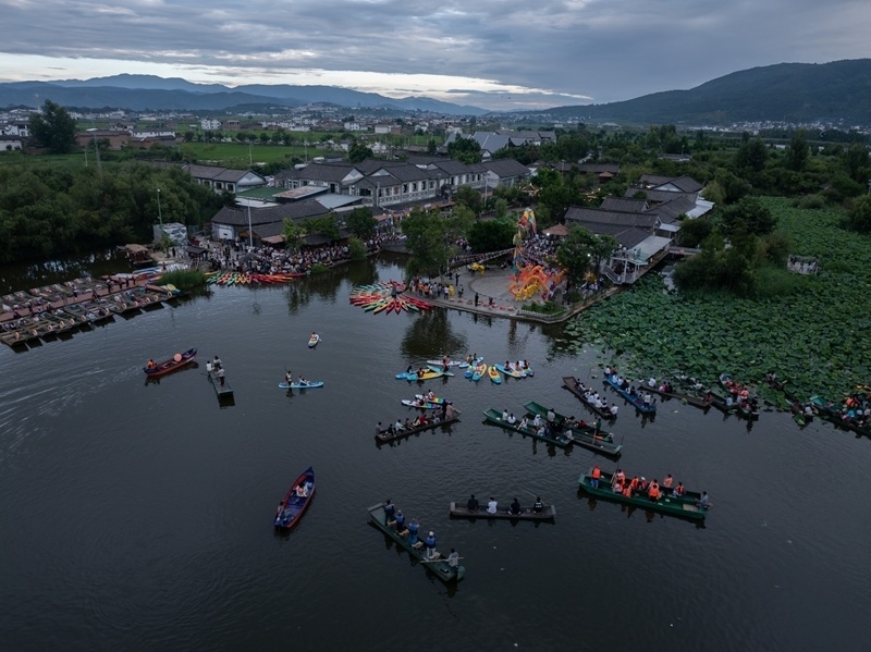7月19日,人們?cè)诖罄砦骱g度水上火把節(jié)(無(wú)人機(jī)照片)。