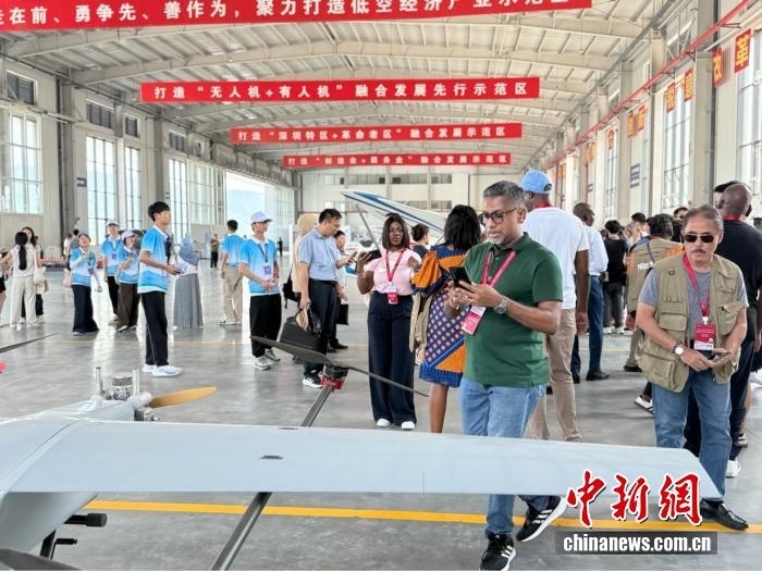 7月16日,在江西省贛州市南康區(qū)低空經(jīng)濟(jì)產(chǎn)業(yè)園,外媒記者參觀無人機(jī)。中新網(wǎng) 黃方 攝
