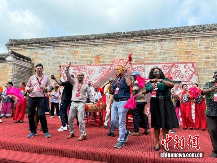 中新網(wǎng)7月21日電(記者 黃方) 鼓聲“咚咚咚”在江西贛州龍南市關(guān)西新圍響起,非洲記者大會秘書長威廉·奧洛首次嘗試舞龍。他興奮地?fù)u動著龍頭,跟隨節(jié)奏躍動,忍不住連聲贊嘆:“這太有節(jié)奏感了!”