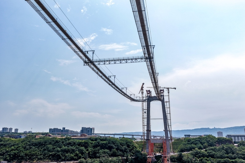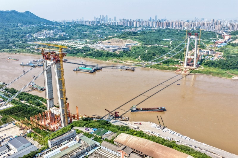 當日,由重慶城投集團投資、城投建設公司組織建設、中國鐵建大橋局承建的黃桷沱長江大橋順利完成主纜架設工作,標志著大橋建設即將進入鋼桁梁吊裝工序。黃桷沱長江大橋全長1260米,主跨765米,為單跨懸吊雙塔三跨連續(xù)鋼桁梁懸索橋,是國內(nèi)最大跨徑公軌兩用懸索橋。黃桷沱長江大橋是渝長高速復線連接道工程的控制性節(jié)點工程,建成后將成為聯(lián)系重慶主城區(qū)長江南北兩岸的重要交通干道。