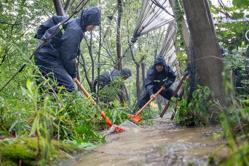 7月30日,在浙江省湖州市長(zhǎng)興縣夾浦鎮(zhèn)長(zhǎng)平村一處葡萄基地,黨員志愿者、民兵幫助農(nóng)戶(hù)排水通渠。