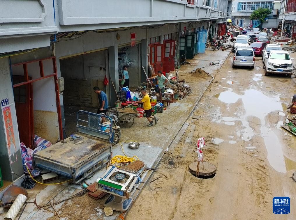 8月6日,工作人員在廣東肇慶鼎湖區(qū)鼎湖山風(fēng)景區(qū)門口清淤(無人機(jī)照片)。