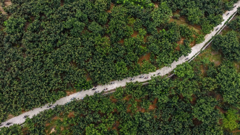 8月8日,騎行愛好者在河北省遵化市蘇家洼鎮(zhèn)二道嶺村騎行(無人機照片)。