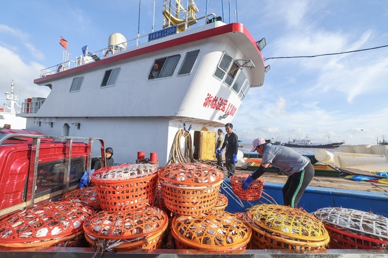 8月12日,開(kāi)漁歸來(lái)的漁運(yùn)船靠泊在舟山沈家門(mén)舟山國(guó)際水產(chǎn)城碼頭,漁民把整筐的梭子蟹運(yùn)送上岸裝車(chē)。