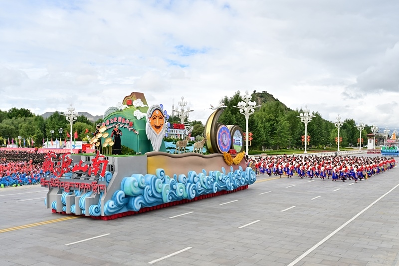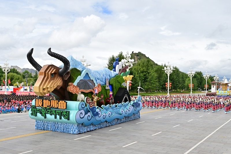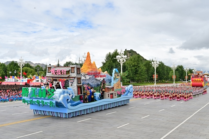 8月21日上午,西藏各族各界干部群眾約2萬人歡聚拉薩市布達(dá)拉宮廣場,熱烈慶祝西藏自治區(qū)成立60周年。這是游行的彩車通過布達(dá)拉宮廣場。