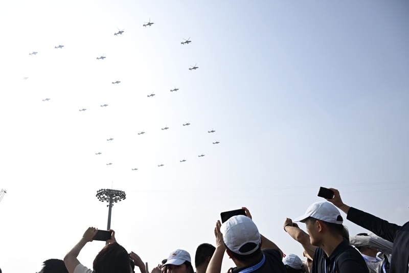 9月3日,紀(jì)念中國(guó)人民抗日戰(zhàn)爭(zhēng)暨世界反法西斯戰(zhàn)爭(zhēng)勝利80周年大會(huì)在北京隆重舉行。這是空中護(hù)旗梯隊(duì)。
