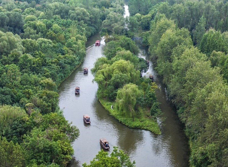 10月1日,游客在江蘇省泰州市姜堰區(qū)溱湖國(guó)家濕地公園乘船游玩(無(wú)人機(jī)照片)。