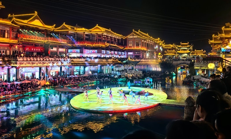 10月1日晚,在四川省眉山市東坡區(qū)無憂城水街,游客在觀看演出《東坡奇妙游》。