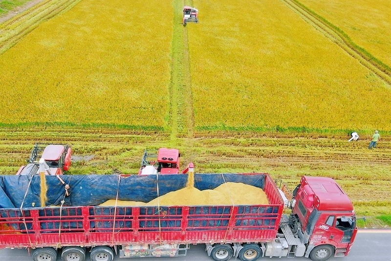 10月17日,在湖南省永州市道縣梅花鎮(zhèn)梅花村,水稻種植大戶采用大型機(jī)械收獲稻谷(無人機(jī)照片)。