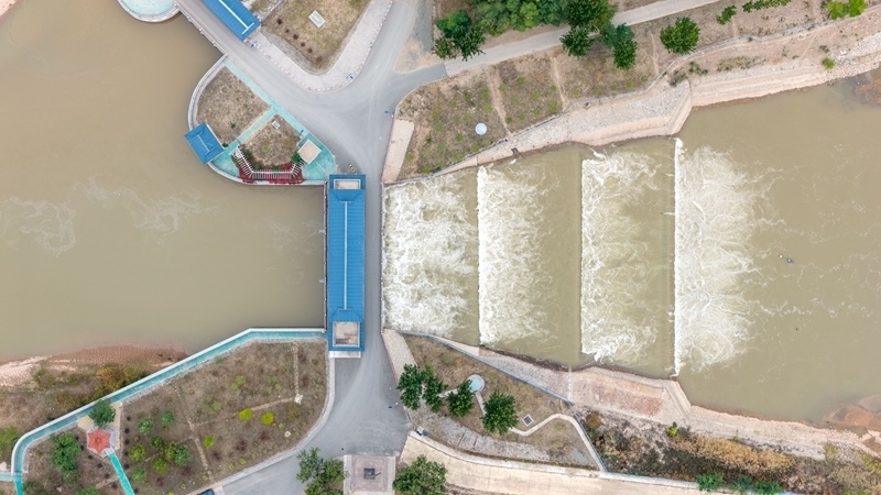 10月16日,用于灌溉的黃河水流經(jīng)內(nèi)蒙古巴彥淖爾市臨河區(qū)境內(nèi)的總干渠第二分水樞紐(無人機(jī)照片)。