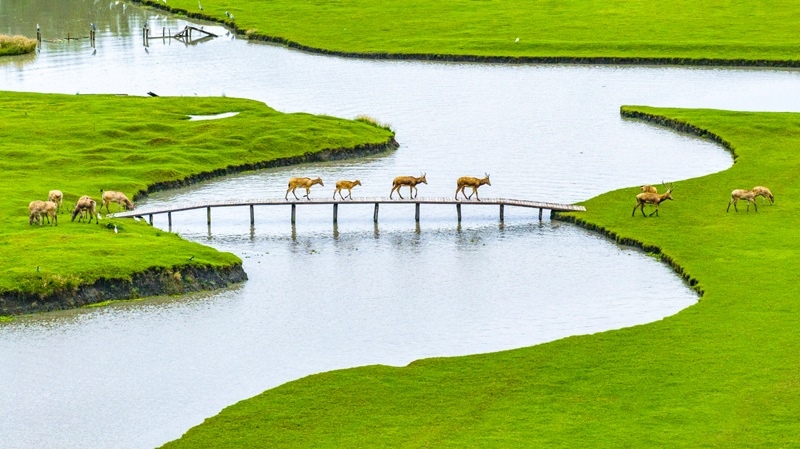 10月17日,在江蘇省泰州市姜堰區(qū)溱湖國(guó)家濕地公園,一群麋鹿通過獨(dú)木橋(無人機(jī)照片)。