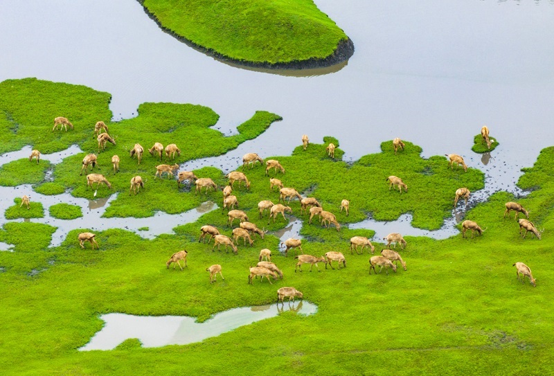 10月17日,在江蘇省泰州市姜堰區(qū)溱湖國(guó)家濕地公園,一群麋鹿在棲息、覓食(無人機(jī)照片)。