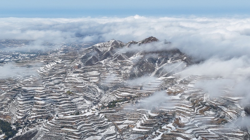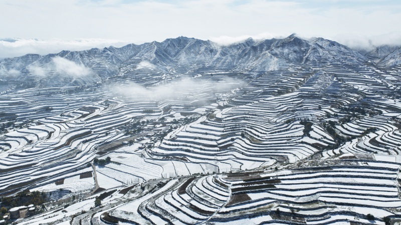 這是10月17日在甘肅永靖縣陳井鎮(zhèn)拍攝的雪后梯田(無人機(jī)照片)。