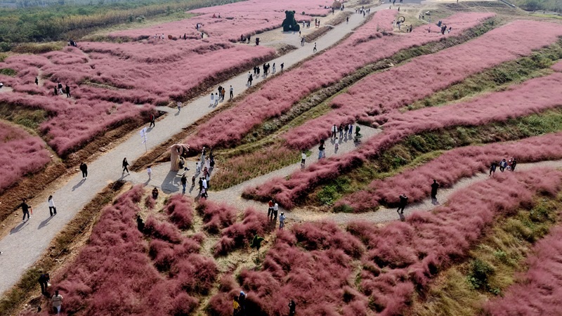 10月18日,游客在山東省臨沂市平邑縣柏林鎮(zhèn)粉黛亂子草花田游玩(無人機(jī)照片)。