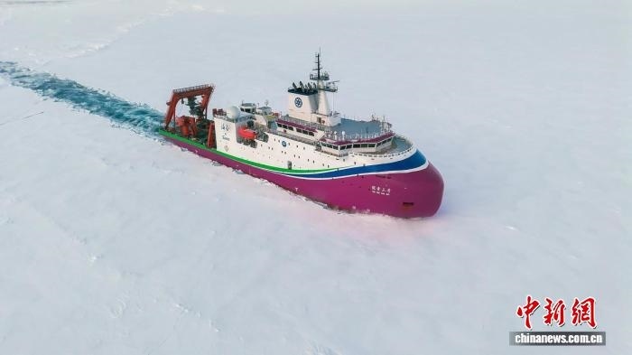 圖為2025年9月,“探索三號”在北極密集冰區(qū)破冰航行。(中國科學(xué)院深海科學(xué)與工程研究所 供圖)