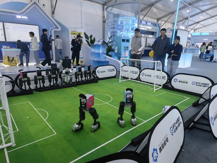 機(jī)器人在第八屆世界聲博會(huì)上進(jìn)行足球比賽(11月3日攝)。新華社記者 汪海月 攝