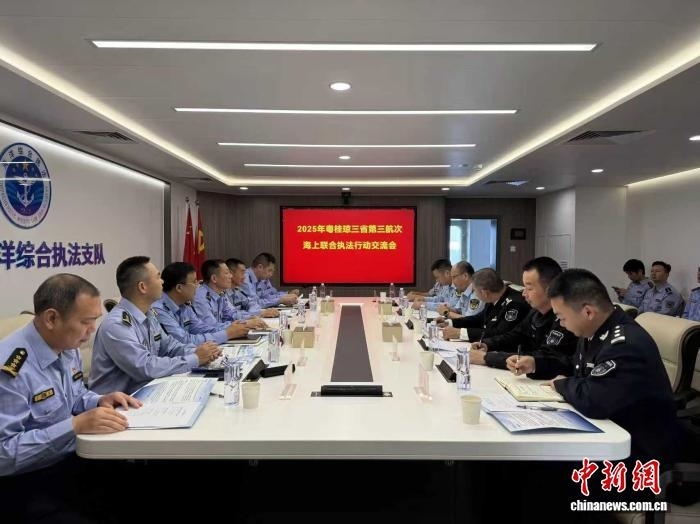 11月12日,粵桂瓊?cè)?區(qū))第三次海上聯(lián)合執(zhí)法行動交流會在中國漁政44002船召開。廣東省海洋綜合執(zhí)法總隊 供圖