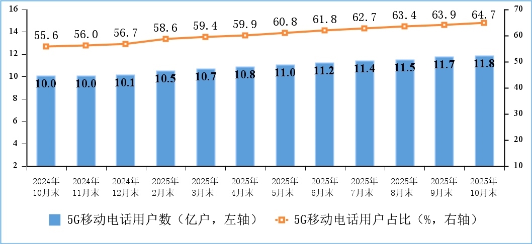 移動(dòng)電話用戶規(guī)模穩(wěn)中有增,5G用戶數(shù)持續(xù)增加。截至10月末,三家基礎(chǔ)電信企業(yè)及中國(guó)廣電的移動(dòng)電話用戶總數(shù)達(dá)18.3億戶,比上年末凈增4015萬(wàn)戶。其中,5G移動(dòng)電話用戶達(dá)11.84億戶,比上年末凈增1.7億戶,占移動(dòng)電話用戶的64.7%。