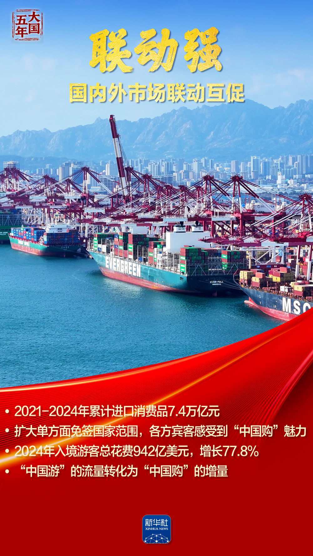 這五年,“智能”“綠色”煥新潮涌,國風(fēng)文創(chuàng)、數(shù)字消費(fèi)勾勒品質(zhì)生活新圖景;服務(wù)消費(fèi)快速增長折射結(jié)構(gòu)優(yōu)化;“中國機(jī)遇”惠及世界,“中國市場”成為共享市場。跟隨海報(bào),共同見證超大規(guī)模市場蘊(yùn)藏的磅礴底氣,感受提振內(nèi)需釋放的澎湃動(dòng)力。