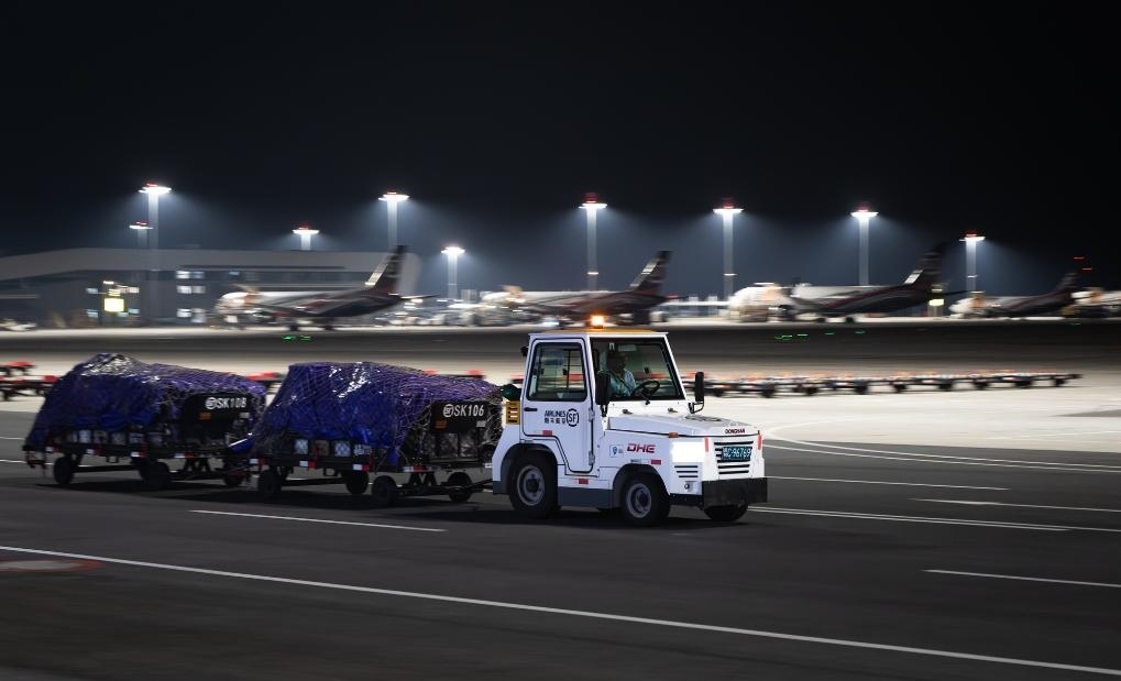 子夜時(shí)分,記者驅(qū)車來到這座機(jī)場(chǎng)時(shí),撲面而來的是一派“不夜空港”的繁忙景象:雪亮的停機(jī)坪上,貨機(jī)剛一停穩(wěn),工作人員便操控牽引車、加油車、轉(zhuǎn)運(yùn)車簇?fù)矶?,卸貨、加油、檢查,井井有條,一刻也不耽誤。