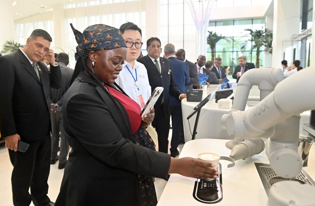 10月29日,駐華使節(jié)代表團(tuán)在中國-東盟國家人工智能應(yīng)用合作中心參觀體驗(yàn)機(jī)器人制作咖啡。新華社記者 陸波岸 攝