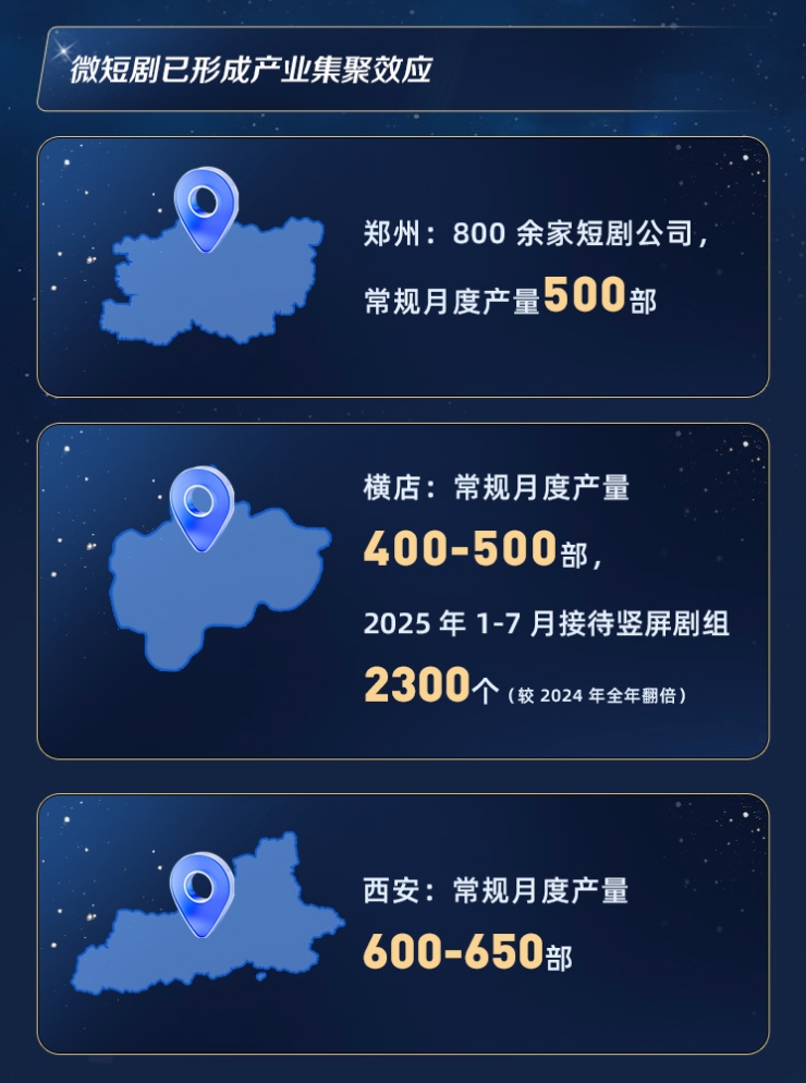 數(shù)據(jù)顯示,全國(guó)短劇月度產(chǎn)量已穩(wěn)定在約3000部,并在區(qū)域分工趨勢(shì)下,帶動(dòng)就業(yè)從一線(xiàn)城市向中西部擴(kuò)散。鄭州、西安、橫店等地,正成為這一產(chǎn)業(yè)地理格局的重要支點(diǎn)。
