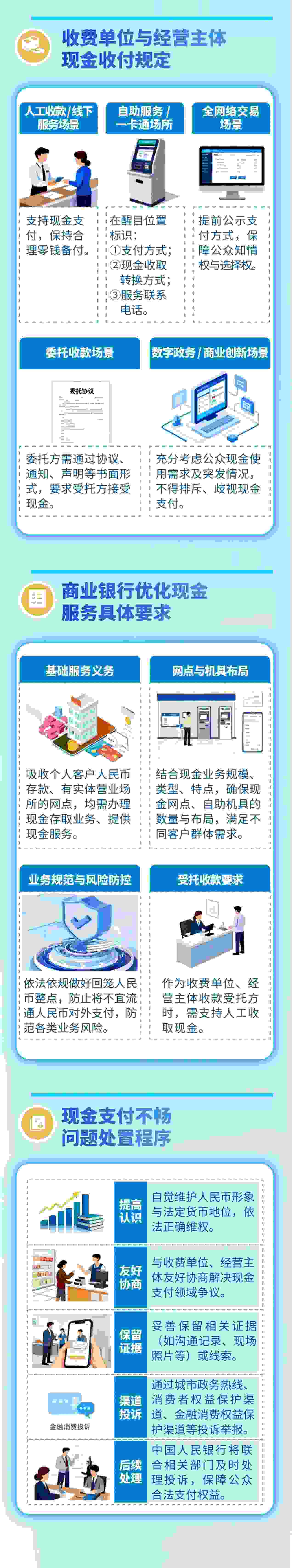 《規(guī)定》基于分類管理和普遍適用的原則,提出保障現(xiàn)金支付的基本要求。主要包括以下幾方面: