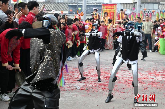2月24日,廣東省潮州市田頭何村開展民俗巡游活動,機器人與布馬舞舞者共舞,吸引村民觀看。中新社記者 陳楚紅 攝