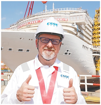 羅瓦蒂在建造中的“愛達(dá)·花城號(hào)”郵輪前。