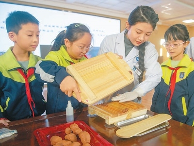 河北省滄州中西醫(yī)結合醫(yī)院,中藥師(右二)在為小學生演示中藥蜜丸的制作工藝。