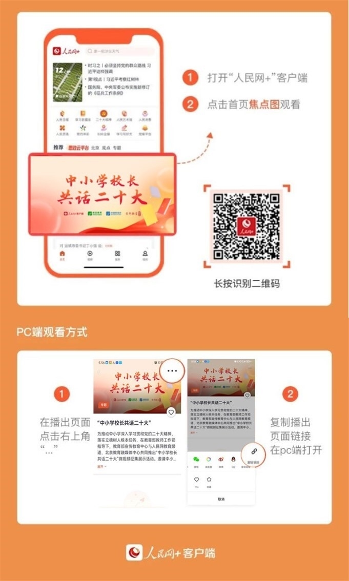 5月12日起,“人民網(wǎng)+”客戶端推出“中小學(xué)校長共話二十大”專題節(jié)目,每日11:00上新,圍繞黨的領(lǐng)導(dǎo)、鑄魂育人、教育改革、教育公平、強師興校等話題述成績、言感悟、談現(xiàn)狀、話未來,切實把黨的二十大精神轉(zhuǎn)化為辦學(xué)治校、教書育人的實際行動。讓我們一起傾聽全國百位中小學(xué)校長共話二十大,共同描繪教育事業(yè)發(fā)展的新藍(lán)圖。